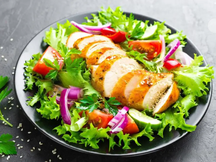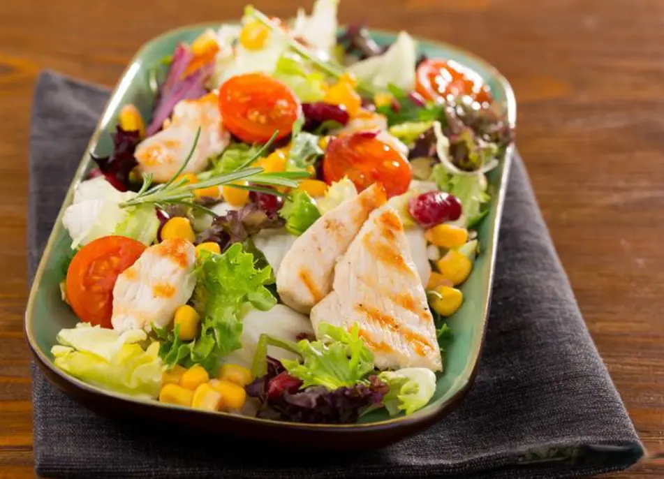 4. 拌沙拉:在一个大碗中,将所有蔬菜和鸡胸肉放入,加入适量盐、黑胡椒粉调味。可以根据个人喜好加入一些橄榄油,或者沙拉酱、酸奶等调料,拌匀。