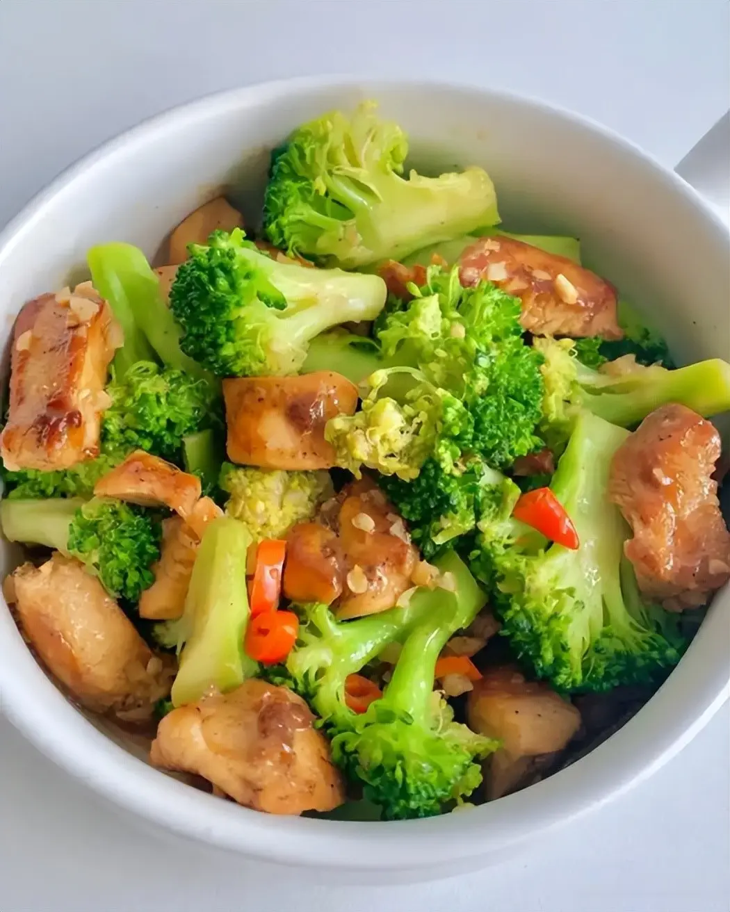 9. 出锅装盘:炒好的西兰花鸡胸肉盛出,装盘,温热即可享用。